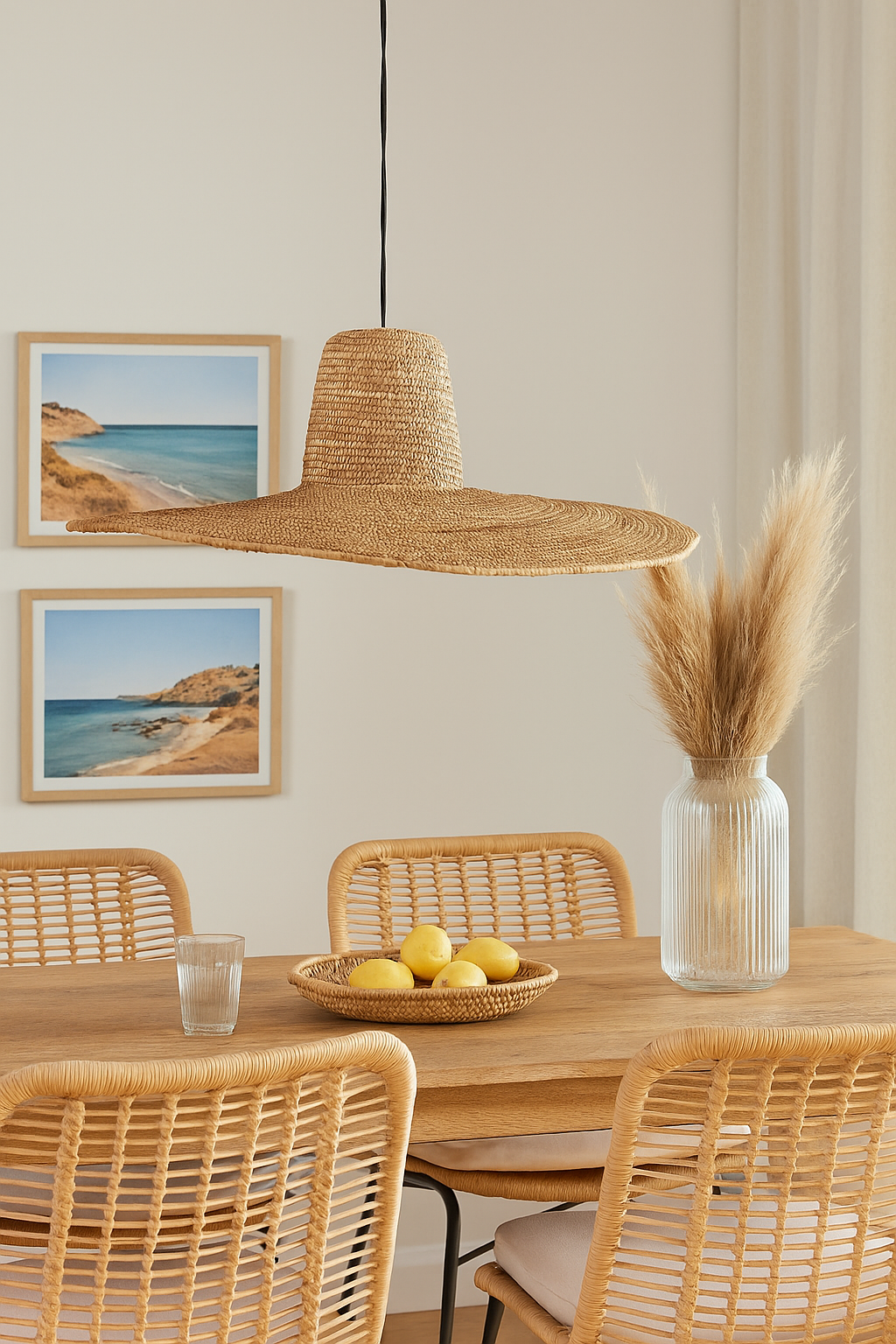 Illuminate your space with this unique hat-shaped chandelier, handcrafted from natural banana leaves. Each piece is individually woven by artisans, celebrating organic texture and sustainable design. Its warm, earthy tones and sculptural silhouette bring a touch of tropical elegance and handmade authenticity to any interior.